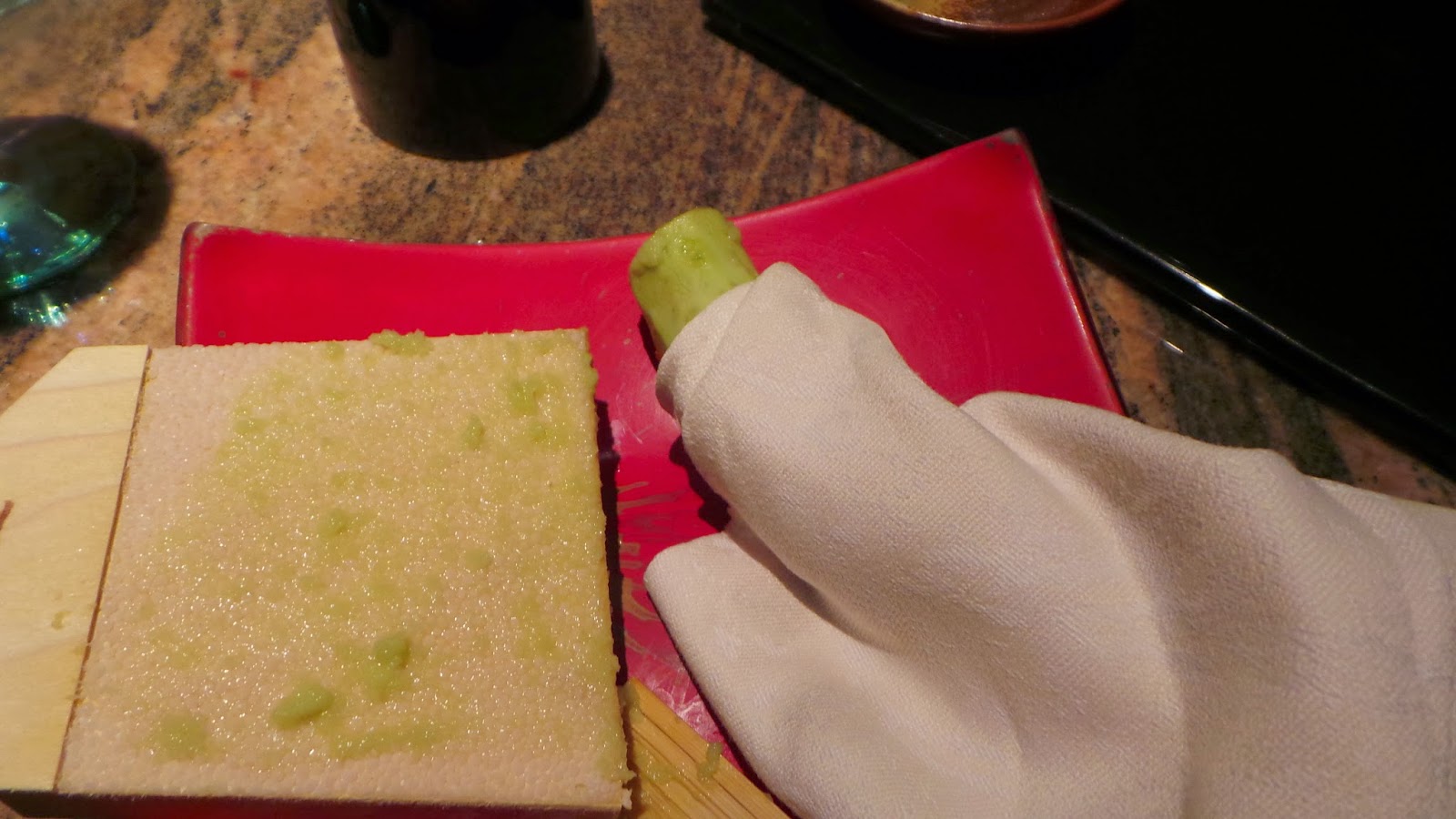 | Fresh wasabi is grated and served — hadn’t seen that before! |